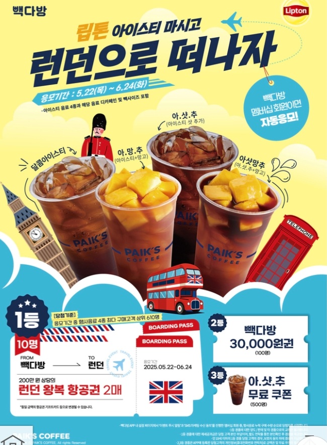 올여름 빽다방이 립톤과 손잡고 런던 왕복 항공권 이벤트를 시작했습니다.
