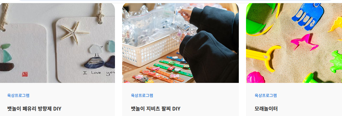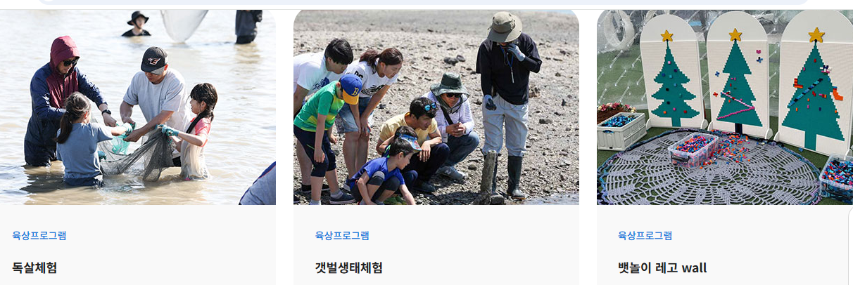 | 육상 프로그램:독살체험/갯벌생태체험/뱃놀이 레고wall/뱃놀이 폐유리 방향제diy/뱃놀이 지비츠팔찌diy/ 모래 놀이터/딩기요트/수상레져 펀보드 ![]() ![]() |